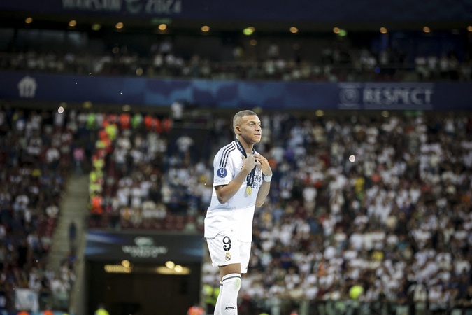 9 KYLIAN MBAPPE (RM) Real Madrid celebrate victory after the UEFA Super Cup 2024 - Match de football "Real Madrid vs Atlanta" lors de la Supercoupe de l'UEFA. Le 14 août 2024 © Elyxandro CEGARRA / Panoramic / Bestimage