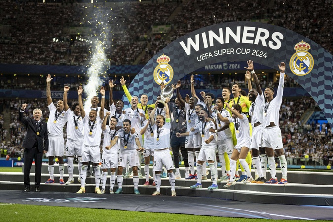 Real Madrid celebrate victory after the UEFA Super Cup 2024 - Match de football "Real Madrid vs Atlanta" lors de la Supercoupe de l'UEFA. Le 14 août 2024 © Elyxandro CEGARRA / Panoramic / Bestimage