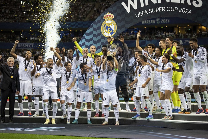 Real Madrid celebrate victory after the UEFA Super Cup 2024 - Match de football "Real Madrid vs Atlanta" lors de la Supercoupe de l'UEFA. Le 14 août 2024 © Elyxandro CEGARRA / Panoramic / Bestimage