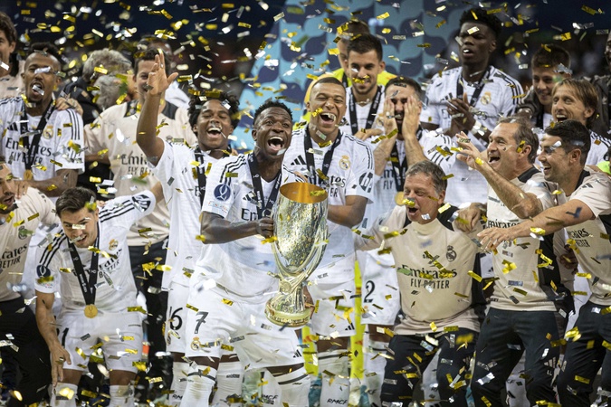 Real Madrid celebrate victory after the UEFA Super Cup 2024 - Match de football "Real Madrid vs Atlanta" lors de la Supercoupe de l'UEFA. Le 14 août 2024 © Elyxandro CEGARRA / Panoramic / Bestimage