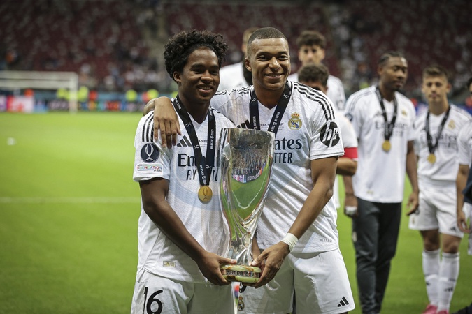 9 KYLIAN MBAPPE (RM) 16 ENDRICK (RM) Real Madrid celebrate victory after the UEFA Super Cup 2024 - Match de football "Real Madrid vs Atlanta" lors de la Supercoupe de l'UEFA. Le 14 août 2024 © Elyxandro CEGARRA / Panoramic / Bestimage