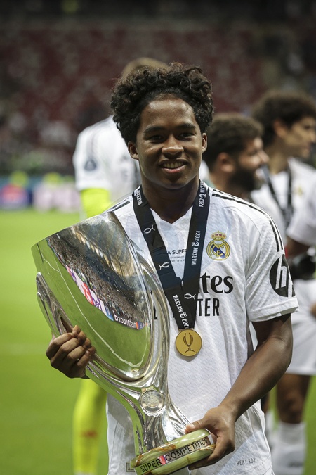 16 ENDRICK (RM) Real Madrid celebrate victory after the UEFA Super Cup 2024 - Match de football "Real Madrid vs Atlanta" lors de la Supercoupe de l'UEFA. Le 14 août 2024 © Elyxandro CEGARRA / Panoramic / Bestimage