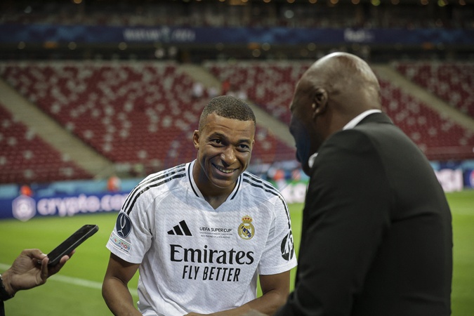 9 KYLIAN MBAPPE (RM) and wilfried mbappe Real Madrid celebrate victory after the UEFA Super Cup 2024 - Match de football "Real Madrid vs Atlanta" lors de la Supercoupe de l'UEFA. Le 14 août 2024 © Elyxandro CEGARRA / Panoramic / Bestimage