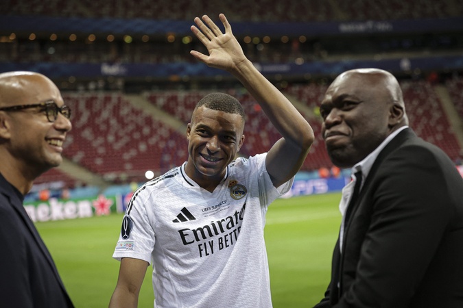 9 KYLIAN MBAPPE (RM) and wilfried mbappe Real Madrid celebrate victory after the UEFA Super Cup 2024 - Match de football "Real Madrid vs Atlanta" lors de la Supercoupe de l'UEFA. Le 14 août 2024 © Elyxandro CEGARRA / Panoramic / Bestimage