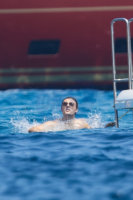 Semi-Exclusif - Prix Spécial - No web - Elizabeth Hurley et son fils Damian, Joan Collins et son mari Percy Gibson passent la journée sur un yacht au large de Saint-Tropez, le 13 août 2024. Si Damian a choisi de se baigner, Elizabeth Hurley semblait hésiter entre plusieurs glaces sur la carte proposée par un marchand itinérant. Récemment, Damian Hurley est passé derrière la caméra pour réaliser le film "Strictly Confidential" avec sa mère dans le rôle principal. Semi-Exclusive - Special Price - No web - Elizabeth Hurley and her son Damian, Joan Collins and her husband Percy Gibson spend the day on a yacht off the coast of Saint-Tropez, August 13, 2024. While Damian chose to go for a swim, Elizabeth Hurley seemed to be hesitating between several ice creams on the menu offered by a traveling vendor. Recently, Damian Hurley stepped behind the camera to direct the film "Strictly Confidential" with his mother in the lead role.
