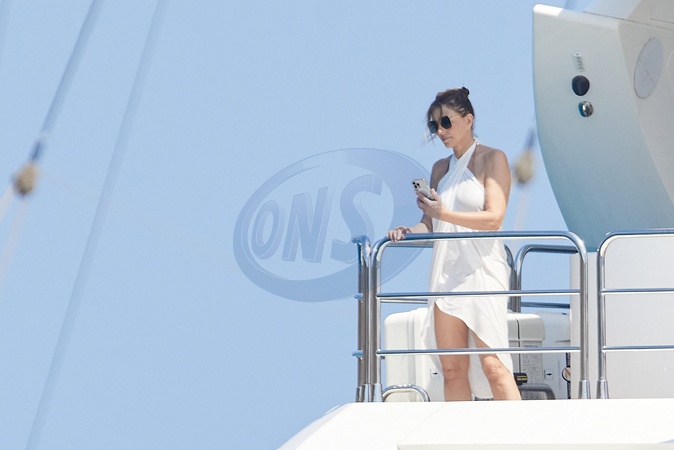 Semi-Exclusif - Prix Spécial - No web - Elizabeth Hurley et son fils Damian, Joan Collins et son mari Percy Gibson passent la journée sur un yacht au large de Saint-Tropez, le 13 août 2024. Si Damian a choisi de se baigner, Elizabeth Hurley semblait hésiter entre plusieurs glaces sur la carte proposée par un marchand itinérant. Récemment, Damian Hurley est passé derrière la caméra pour réaliser le film "Strictly Confidential" avec sa mère dans le rôle principal. Semi-Exclusive - Special Price - No web - Elizabeth Hurley and her son Damian, Joan Collins and her husband Percy Gibson spend the day on a yacht off the coast of Saint-Tropez, August 13, 2024. While Damian chose to go for a swim, Elizabeth Hurley seemed to be hesitating between several ice creams on the menu offered by a traveling vendor. Recently, Damian Hurley stepped behind the camera to direct the film "Strictly Confidential" with his mother in the lead role.