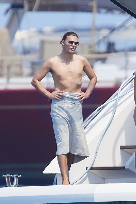 Semi-Exclusif - Prix Spécial - No web - Elizabeth Hurley et son fils Damian, Joan Collins et son mari Percy Gibson passent la journée sur un yacht au large de Saint-Tropez, le 13 août 2024. Si Damian a choisi de se baigner, Elizabeth Hurley semblait hésiter entre plusieurs glaces sur la carte proposée par un marchand itinérant. Récemment, Damian Hurley est passé derrière la caméra pour réaliser le film "Strictly Confidential" avec sa mère dans le rôle principal. Semi-Exclusive - Special Price - No web - Elizabeth Hurley and her son Damian, Joan Collins and her husband Percy Gibson spend the day on a yacht off the coast of Saint-Tropez, August 13, 2024. While Damian chose to go for a swim, Elizabeth Hurley seemed to be hesitating between several ice creams on the menu offered by a traveling vendor. Recently, Damian Hurley stepped behind the camera to direct the film "Strictly Confidential" with his mother in the lead role.