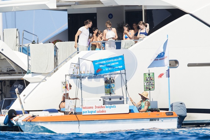 Semi-Exclusif - Prix Spécial - No web - Elizabeth Hurley et son fils Damian, Joan Collins et son mari Percy Gibson passent la journée sur un yacht au large de Saint-Tropez, le 13 août 2024. Si Damian a choisi de se baigner, Elizabeth Hurley semblait hésiter entre plusieurs glaces sur la carte proposée par un marchand itinérant. Récemment, Damian Hurley est passé derrière la caméra pour réaliser le film "Strictly Confidential" avec sa mère dans le rôle principal. Merci de flouter le visage des enfants avant parution. Semi-Exclusive - Special Price - No web - Elizabeth Hurley and her son Damian, Joan Collins and her husband Percy Gibson spend the day on a yacht off the coast of Saint-Tropez, August 13, 2024. While Damian chose to go for a swim, Elizabeth Hurley seemed to be hesitating between several ice creams on the menu offered by a traveling vendor. Recently, Damian Hurley stepped behind the camera to direct the film "Strictly Confidential" with his mother in the lead role. Please pixelate children faces before publishing.