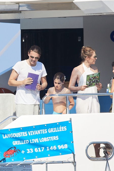 Semi-Exclusif - Prix Spécial - No web - Elizabeth Hurley et son fils Damian, Joan Collins et son mari Percy Gibson passent la journée sur un yacht au large de Saint-Tropez