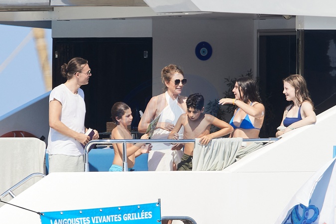 Semi-Exclusif - Prix Spécial - No web - Elizabeth Hurley et son fils Damian, Joan Collins et son mari Percy Gibson passent la journée sur un yacht au large de Saint-Tropez, le 13 août 2024. Si Damian a choisi de se baigner, Elizabeth Hurley semblait hésiter entre plusieurs glaces sur la carte proposée par un marchand itinérant. Récemment, Damian Hurley est passé derrière la caméra pour réaliser le film "Strictly Confidential" avec sa mère dans le rôle principal. Merci de flouter le visage des enfants avant parution. Semi-Exclusive - Special Price - No web - Elizabeth Hurley and her son Damian, Joan Collins and her husband Percy Gibson spend the day on a yacht off the coast of Saint-Tropez, August 13, 2024. While Damian chose to go for a swim, Elizabeth Hurley seemed to be hesitating between several ice creams on the menu offered by a traveling vendor. Recently, Damian Hurley stepped behind the camera to direct the film "Strictly Confidential" with his mother in the lead role. Please pixelate children faces before publishing.