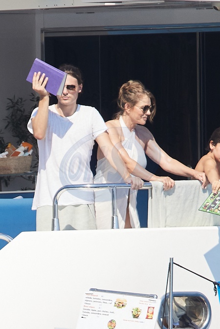 Semi-Exclusif - Prix Spécial - No web - Elizabeth Hurley et son fils Damian, Joan Collins et son mari Percy Gibson passent la journée sur un yacht au large de Saint-Tropez