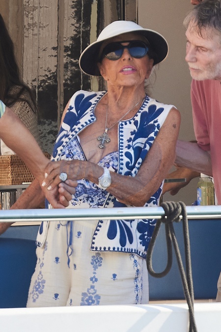 Exclusif - Prix Spécial - No web - Elizabeth Hurley et son fils Damian, Joan Collins et son mari Percy Gibson passent la journée sur un yacht au large de Saint-Tropez, le 13 août 2024. Si Damian a choisi de se baigner, Elizabeth Hurley semblait hésiter entre plusieurs glaces sur la carte proposée par un marchand itinérant. Récemment, Damian Hurley est passé derrière la caméra pour réaliser le film "Strictly Confidential" avec sa mère dans le rôle principal. Exclusive - Special Price - No web - Elizabeth Hurley and her son Damian, Joan Collins and her husband Percy Gibson spend the day on a yacht off the coast of Saint-Tropez, August 13, 2024. While Damian chose to go for a swim, Elizabeth Hurley seemed to be hesitating between several ice creams on the menu offered by a traveling vendor. Recently, Damian Hurley stepped behind the camera to direct the film "Strictly Confidential" with his mother in the lead role.