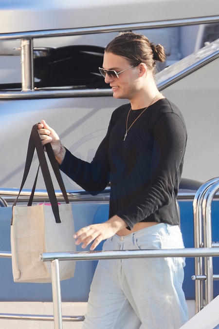 Exclusif - Prix Spécial - No web - Elizabeth Hurley et son fils Damian, Joan Collins et son mari Percy Gibson passent la journée sur un yacht au large de Saint-Tropez, le 13 août 2024. Si Damian a choisi de se baigner, Elizabeth Hurley semblait hésiter entre plusieurs glaces sur la carte proposée par un marchand itinérant. Récemment, Damian Hurley est passé derrière la caméra pour réaliser le film "Strictly Confidential" avec sa mère dans le rôle principal. Exclusive - Special Price - No web - Elizabeth Hurley and her son Damian, Joan Collins and her husband Percy Gibson spend the day on a yacht off the coast of Saint-Tropez, August 13, 2024. While Damian chose to go for a swim, Elizabeth Hurley seemed to be hesitating between several ice creams on the menu offered by a traveling vendor. Recently, Damian Hurley stepped behind the camera to direct the film "Strictly Confidential" with his mother in the lead role.