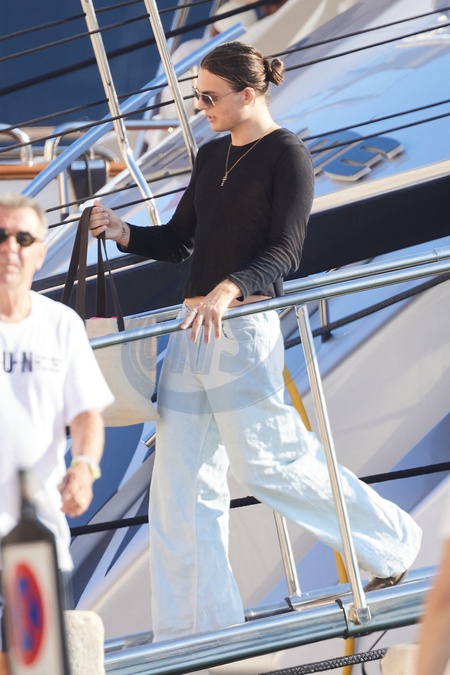 Exclusif - Prix Spécial - No web - Elizabeth Hurley et son fils Damian, Joan Collins et son mari Percy Gibson passent la journée sur un yacht au large de Saint-Tropez, le 13 août 2024. Si Damian a choisi de se baigner, Elizabeth Hurley semblait hésiter entre plusieurs glaces sur la carte proposée par un marchand itinérant. Récemment, Damian Hurley est passé derrière la caméra pour réaliser le film "Strictly Confidential" avec sa mère dans le rôle principal. Exclusive - Special Price - No web - Elizabeth Hurley and her son Damian, Joan Collins and her husband Percy Gibson spend the day on a yacht off the coast of Saint-Tropez, August 13, 2024. While Damian chose to go for a swim, Elizabeth Hurley seemed to be hesitating between several ice creams on the menu offered by a traveling vendor. Recently, Damian Hurley stepped behind the camera to direct the film "Strictly Confidential" with his mother in the lead role.