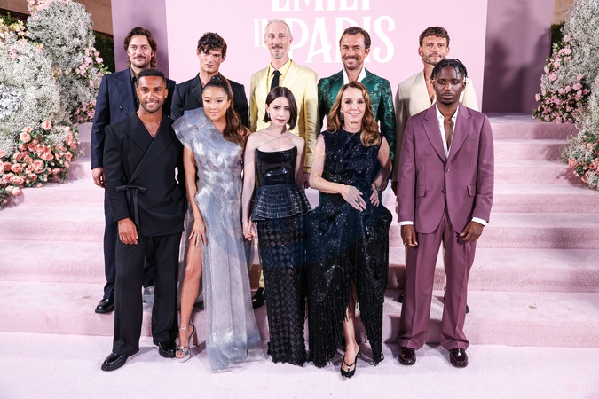 HOLLYWOOD, LOS ANGELES, CALIFORNIA, USA - AUGUST 14: Lucas Bravo, Lucien Laviscount, Paul Forman, Ashley Park, Bruno Gouery, Lily Collins, William Abadie, Philippine Leroy-Beaulieu, Arnaud Binard and Samuel Arnold arrive at the Los Angeles Premiere Of Netflix's 'Emily In Paris' Season 4 Part 1 held at The Egyptian Theatre Hollywood on August 14, 2024 in Hollywood, Los Angeles, California, United States., Credit:Xavier Collin / Avalon