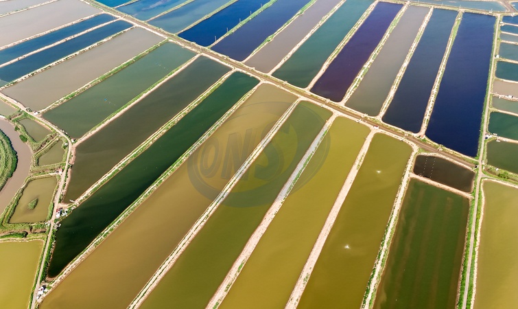 An aerial view of aquacultural ponds built by farmers in the tidal zone in Dingzi Bay in Qingdao in east China's Shandong province Sunday, Aug. 04, 2024., Credit:ZHANG JINGANG / Avalon