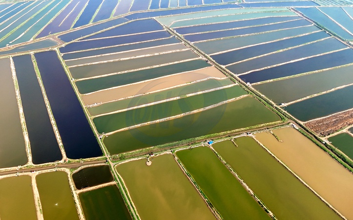 An aerial view of aquacultural ponds built by farmers in the tidal zone in Dingzi Bay in Qingdao in east China's Shandong province Sunday, Aug. 04, 2024., Credit:ZHANG JINGANG / Avalon