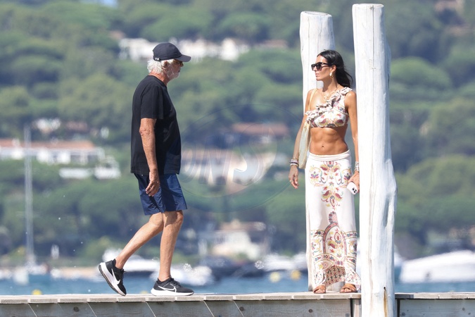 Flavio Briatore et Elisabetta Gregoraci embarquent sur une annexe au Club 55 à Saint-Tropez le 17 août 2024 Flavio Briatore and Elisabetta Gregoraci board a tender at Club 55 in Saint-Tropez on 17 August 2024