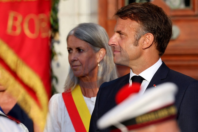 Emmanuel Macron. French President Emmanuel Macron and his wife Brigitte Macron take part in the ceremony marking the 80th anniversary of the liberation of the town of Bormes-les-Mimosas with French Secretary of State for Veterans and Memory Patricia Miralles in Bormes-les-Mimosas, Southern France, on August 17, 2024. © Alain Robert / Pool / Bestimage Le President Francais Emmanuel Macron et sa femme Brigitte Macron participent a la ceremonie du 80eme anniversaire de la liberation de la ville de Bormes-les-Mimosas avec la secretaire d etat des anciens combattants et de la memoire Patricia Miralles a Bormes les Mimosas, le samedi17 aout 2024. //ALAINROBERT_1Y8A1052/Credit:Alain ROBERT/SIPA/2408180706