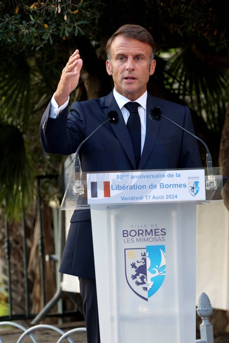 Emmanuel Macron. French President Emmanuel Macron and his wife Brigitte Macron take part in the ceremony marking the 80th anniversary of the liberation of the town of Bormes-les-Mimosas with French Secretary of State for Veterans and Memory Patricia Miralles in Bormes-les-Mimosas, Southern France, on August 17, 2024. © Alain Robert / Pool / Bestimage Le President Francais Emmanuel Macron et sa femme Brigitte Macron participent a la ceremonie du 80eme anniversaire de la liberation de la ville de Bormes-les-Mimosas avec la secretaire d etat des anciens combattants et de la memoire Patricia Miralles a Bormes les Mimosas, le samedi17 aout 2024. //ALAINROBERT_1Y8A1646/Credit:Alain ROBERT/SIPA/2408180709