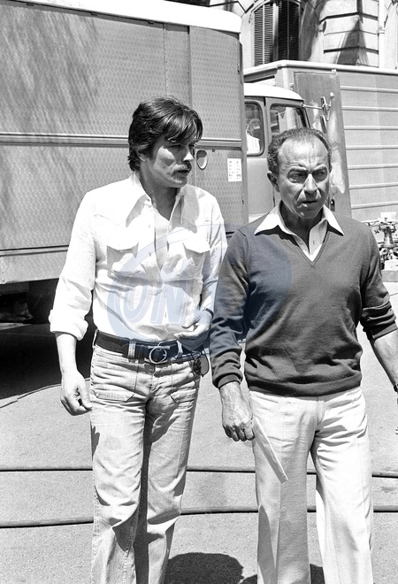 Alain Delon sur le tournage du film "Comme un Boomerang" réalisé par José Giovanni à Nice aux Studios de la Victorine avec des extérieus dans le quartier des Moulins, en mars 1976, ici au Palais de Justice avec Maitre Pasquini qui , en tant qu'avocat serviait de conseiller sur le plateau. © Charles Bebert / Bestimage Famous french actor Alain Delon passed away at 88