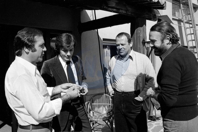 Jean Yanne, Renato Salvatori et Alain Delon sur le tournage du film Armaguedon réalisé par Alain Jessua, à Cagnes sur Mer en 1976 © Charles Bebert / Bestimage Famous french actor Alain Delon passed away at 88