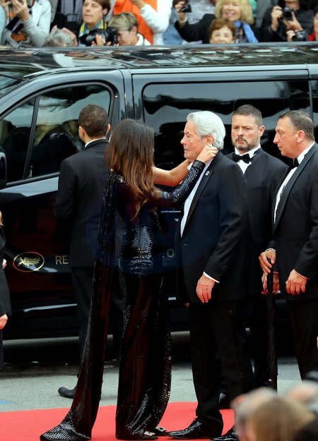 Alain Delon (avec un badge Paris Match d'une ancienne couverture du magazine titrant "Alain Delon, mes deux amours, Rosalie et Anouchka) et sa fille Anouchka Delon (Robe Elie Saab) - Montée des marches du film "A Hidden Life" lors du 72ème Festival International du Film de Cannes. Le 19 mai 2019 © Jacovides-Moreau / Bestimage Red carpet for the movie "A Hidden Life" during the 72nd Cannes International Film festival. On may 19th 2019