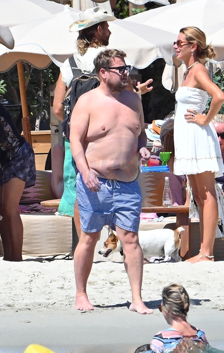Exclusif - James Corden, sa femme Julia Carey et leur fils Max et des amis à la plage à Saint-Tropez