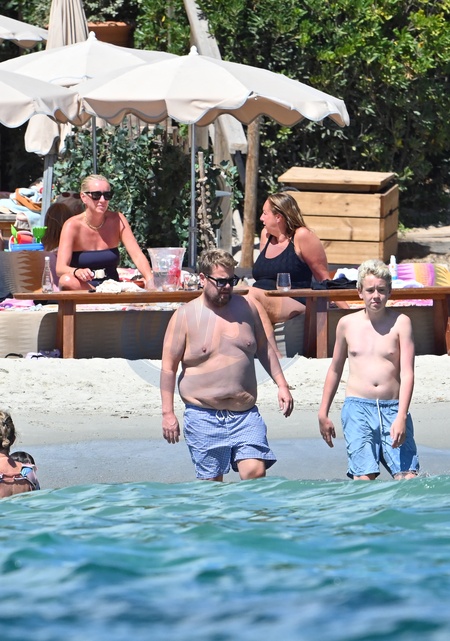 Exclusif - James Corden, sa femme Julia Carey et leur fils Max et des amis à la plage à Saint-Tropez le 19 août 2024. Exclusive - no web - James Corden, his wife Julia Carey and their son Max and friends at the beach in Saint-Tropez