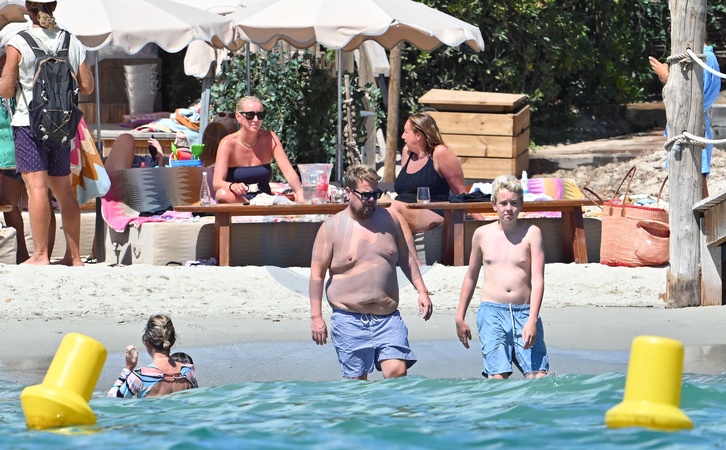 James Corden, jego żona Julia Carey i ich syn Max oraz przyjaciele na plaży w Saint-Tropez
