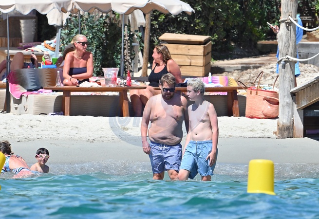 Exclusif - James Corden, sa femme Julia Carey et leur fils Max et des amis à la plage à Saint-Tropez le 19 août 2024. Exclusive - no web - James Corden, his wife Julia Carey and their son Max and friends at the beach in Saint-Tropez