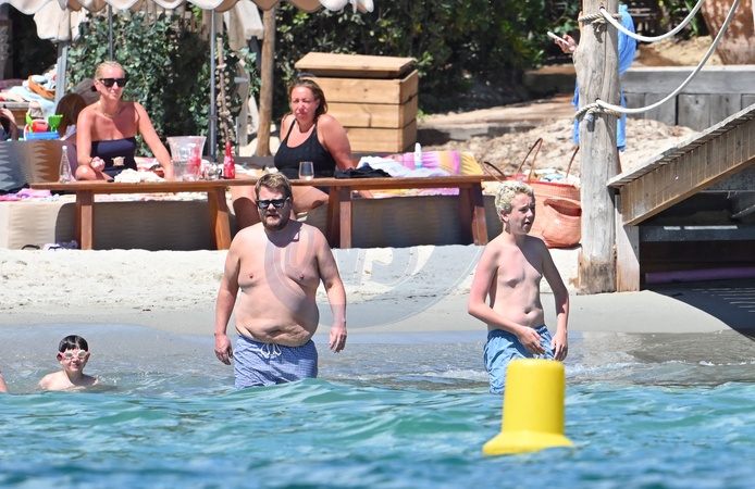 Exclusif - James Corden, sa femme Julia Carey et leur fils Max et des amis à la plage à Saint-Tropez le 19 août 2024. Exclusive - no web - James Corden, his wife Julia Carey and their son Max and friends at the beach in Saint-Tropez