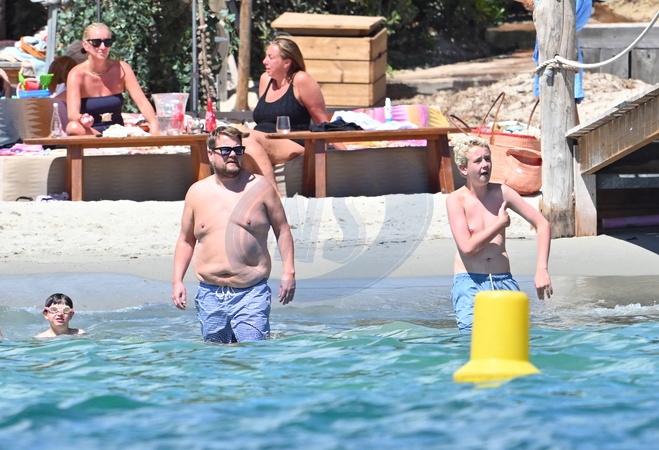 Exclusif - James Corden, sa femme Julia Carey et leur fils Max et des amis à la plage à Saint-Tropez le 19 août 2024. Exclusive - no web - James Corden, his wife Julia Carey and their son Max and friends at the beach in Saint-Tropez