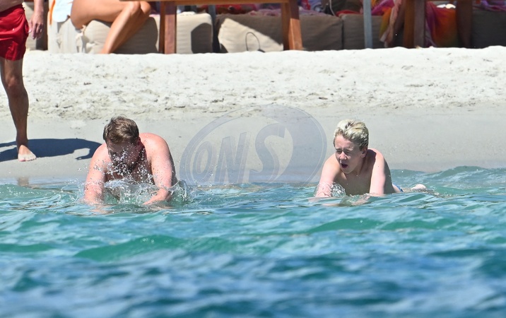 Exclusif - James Corden, sa femme Julia Carey et leur fils Max et des amis à la plage à Saint-Tropez le 19 août 2024. Exclusive - no web - James Corden, his wife Julia Carey and their son Max and friends at the beach in Saint-Tropez