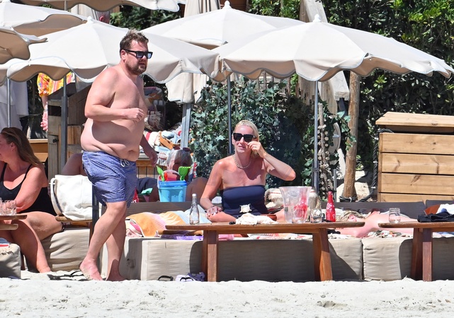 James Corden, jego żona Julia Carey i ich syn Max oraz przyjaciele na plaży w Saint-Tropez