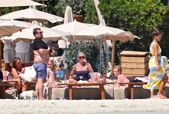 James Corden, jego żona Julia Carey i ich syn Max oraz przyjaciele na plaży w Saint-Tropez