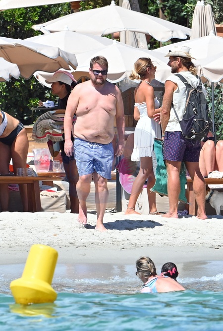 James Corden, jego żona Julia Carey i ich syn Max oraz przyjaciele na plaży w Saint-Tropez