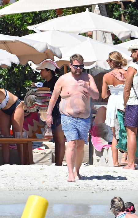 Exclusif - James Corden, sa femme Julia Carey et leur fils Max et des amis à la plage à Saint-Tropez