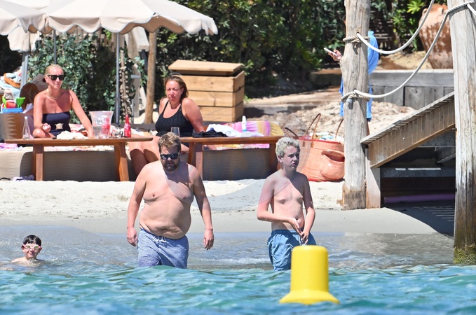 Exclusif - James Corden, sa femme Julia Carey et leur fils Max et des amis à la plage à Saint-Tropez le 19 août 2024. Exclusive - no web - James Corden, his wife Julia Carey and their son Max and friends at the beach in Saint-Tropez