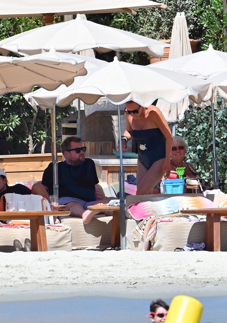 Exclusif - James Corden, sa femme Julia Carey et leur fils Max et des amis à la plage à Saint-Tropez le 19 août 2024. Exclusive - no web - James Corden, his wife Julia Carey and their son Max and friends at the beach in Saint-Tropez