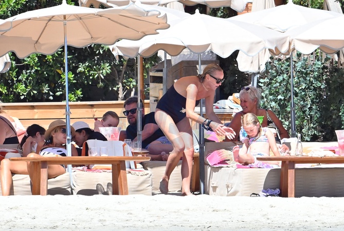 Exclusif - James Corden, sa femme Julia Carey et leur fils Max et des amis à la plage à Saint-Tropez le 19 août 2024. Exclusive - no web - James Corden, his wife Julia Carey and their son Max and friends at the beach in Saint-Tropez