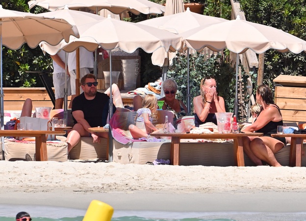 James Corden, jego żona Julia Carey i ich syn Max oraz przyjaciele na plaży w Saint-Tropez