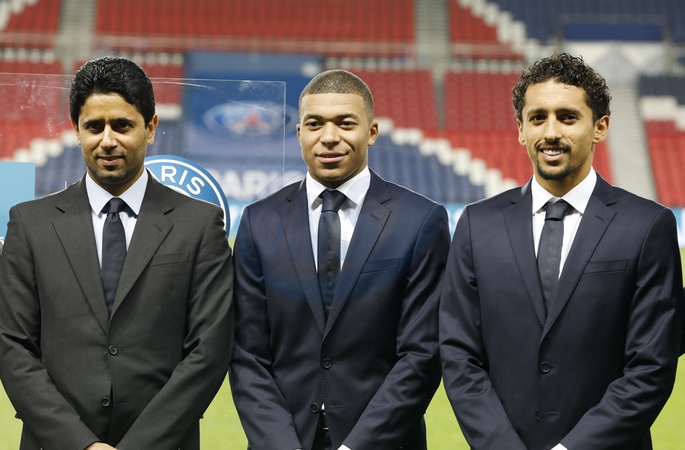 Info - Kylian Mbappé a saisi la LFP et l'UEFA pour réclamer 55 millions d'euros impayés par le PSG - Nasser Al-Khelaïfi, Président-Directeur général du Paris Saint-Germain, Kylian Mbappé et Marquinhos - Le groupe AccorHotels a signé un contrat de sponsoring "All Accor Live Limitless" avec le PSG au parc des Princes en présence des joueurs de l'équipe. Cet accord d'une durée de 3 ans, renouvelable, fait de ALL, le nouveau programme de fidélité d'Accor, le partenaire majeur et sponsor maillot officiel du Club à compter de la saison 2019-2020. Paris le 22 Février 2019 © Marc Ausset-Lacroix/Bestimage All Accor Live Limitless press conference at Parc des Princes: The AccorHotels group has signed a sponsorship contract with PSG; This renewable 3-year agreement makes ALL, the new loyalty program of Accor, the Club's major partner and official jersey sponsor starting in the 2019-2020 season. Paris on February 22, 2019