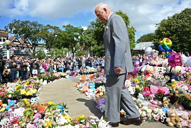 Southport, UK, 20 August 2024: Britain's King Charles III meets with members of the local community during his visit to the Town Hall in Southport, northwest England, following the 29 July attack at a childrens' dance party. Alice Da Silva Aguiar, Bebe King, and Elsie Dot Stancombe were all murdered during the knife attack at a Taylor Swift-themed dance party that also left another 10 people injured., Credit:PAUL ELLIS / Avalon