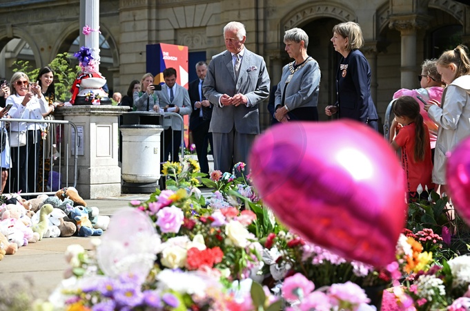 Southport, UK, 20 August 2024: Britain's King Charles III meets with members of the local community during his visit to the Town Hall in Southport, northwest England, following the 29 July attack at a childrens' dance party. Alice Da Silva Aguiar, Bebe King, and Elsie Dot Stancombe were all murdered during the knife attack at a Taylor Swift-themed dance party that also left another 10 people injured., Credit:PAUL ELLIS / Avalon