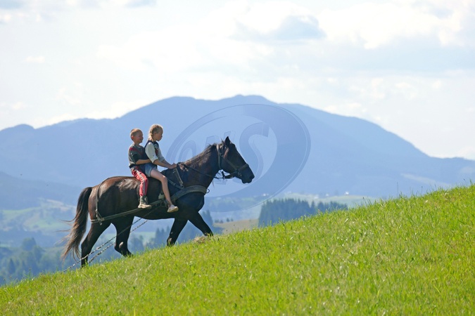 CHERNIVTSI REGION, UKRAINE - JULY 31, 2024 - Children ride a horse in the Carpathians Mountains, Vyzhnytsia district, Chernivtsi region, western Ukraine., Credit:Yurii Rylchuk / Avalon