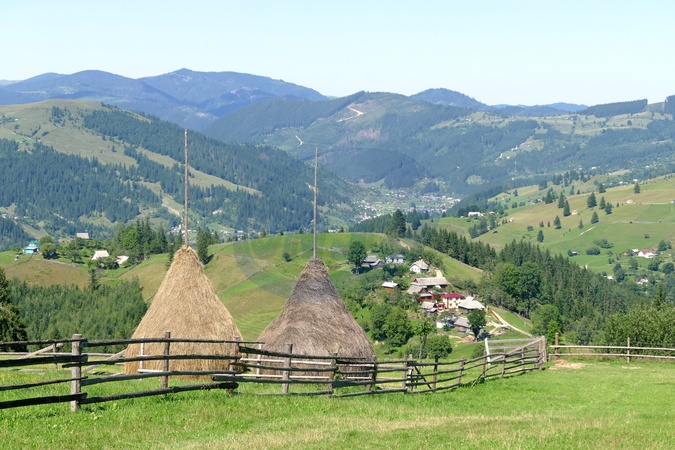 CHERNIVTSI REGION, UKRAINE - JULY 31, 2024 - Haystacks are in the Carpathians Mountains in Vyzhnytsia district, Chernivtsi region, western Ukraine., Credit:Yurii Rylchuk / Avalon