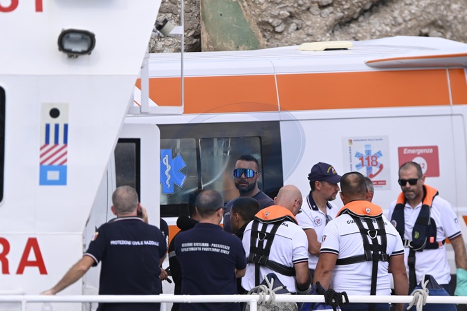 Firefighters and the Italian Coast Guard recover a body from the sunken sailing vessel in Porticello, Sicily, Italy, August 21, 2024. Five people are still missing and 15 passengers have been rescued, after a 56-meter luxury sailing yacht, the Bayesian, with 22 people on board, sank on August 19 due to a tornado that hit the area., Credit:Valeria Ferraro / Avalon