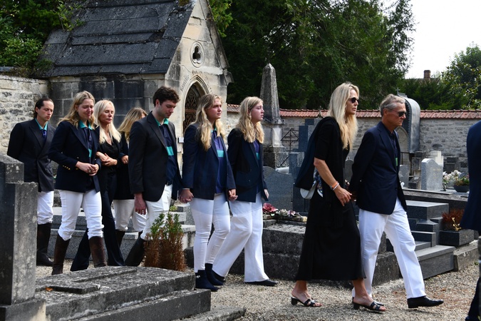 Exclusif - Olaf Guerrand-Hermes et sa femme Eva, Valesca Guerrand-Hermes, Lucien Guerrand Hermes (petit-fils),Oleg Guerrand-Hermes (petit-fils) et autres petits-enfants - Inhumation de Patrick Guerrand-Hermès (Directeur d'Hermès jusque 2012 et patriarche de la famille) au cimetière de Vineuil-Saint-Firmin dans l'Oise le 20 août 2024. Exclusive - Burial of Patrick Guerrand-Hermès (Director of Hermès until 2012 and patriarch of the family) at the Vineuil-Saint-Firmin cemetery in Oise on August 20, 2024.
