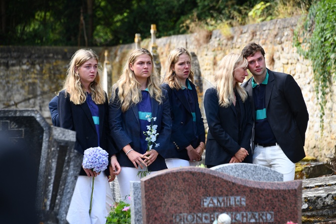 Exclusif - Valesca Guerrand-Hermes et les petits-enfants Lucien Guerrand Hermes, Raphaella Guerrand-Hermes, Elise Guerrand-Hermes et Clea Guerrand Hermes - Inhumation de Patrick Guerrand-Hermès (Directeur d'Hermès jusque 2012 et patriarche de la famille) au cimetière de Vineuil-Saint-Firmin dans l'Oise le 20 août 2024. Exclusive - Burial of Patrick Guerrand-Hermès (Director of Hermès until 2012 and patriarch of the family) at the Vineuil-Saint-Firmin cemetery in Oise on August 20, 2024.